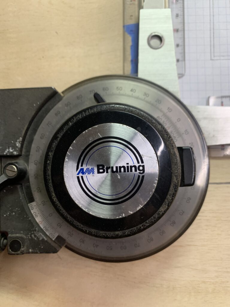 To my delight I discovered a used drafting machine available. It was advertised as the drafting machine only–no table. I bought it for a few hundred dollars and it arrived in good shape. This is a different type of machine than any I ever used. It has a steel track at the top and the vertical drafting arm rolls on that track. Then there is a drafting head with normal rulers that travels up or down that vertical beam. It has a protractor head that turns to any degree you like. It is hard to describe with words but you can see it in the photos.
