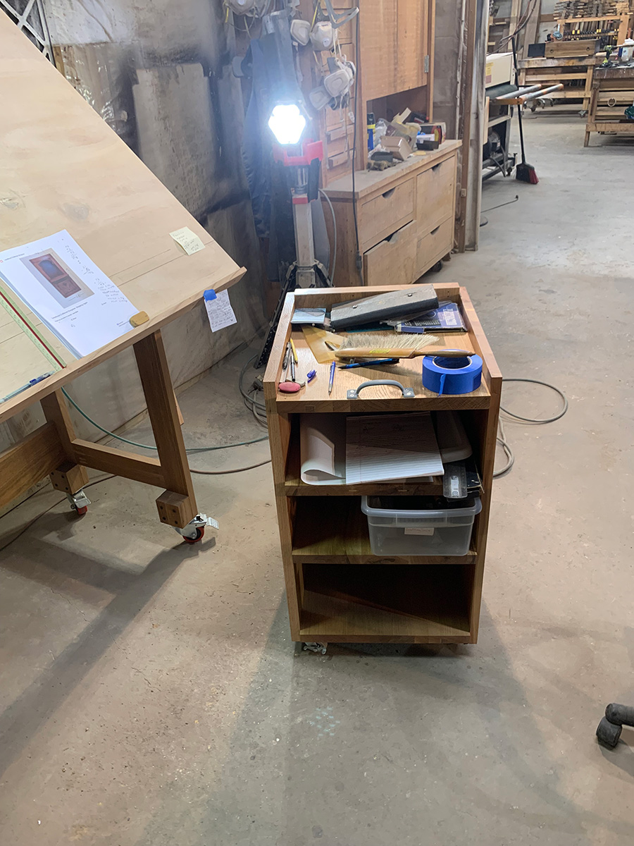 I used a gaggle of old, solid wood panels we had lying around the shop to build a new drafting cart as well to hold the other tools of my trade. The panels were thick and heavy so the cart could maybe someday be used to anchor an aircraft carrier. Well, things in a woodshop must be sturdy.